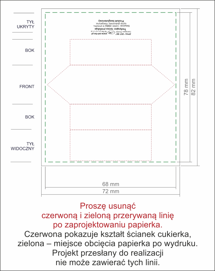 Do zawijania cukierków "krówka reklamowa", "krówka okolicznościowa" stosujemy zarówno papierki dostarczone przez klienta jak również możemy je dla niego wydrukować. Papierki do zawinięcia drukowane są na papierze kredowymo maksymalnej gramaturze 90 gpapierki o wyższej gramaturze mają tendencję do samoczynnego rozwijania się.Zaleca się dodatkowo zabezpieczyć wydruk lakierem offsetowym. Dla małych nakładów(1-5 kg) można użyć wydruku cyfrowego na papierze offsetowym 80-90 g.Przy projektowaniu papierka należy bazować na załączonym szablonie. Proszę zwrócić uwagę że po zawinięciu cukierka część grafiki jest niewidoczna - widoczne zostają pola oznaczone czerwoną przerywaną linią (w gotowym projekcie należy ją usunąć). |